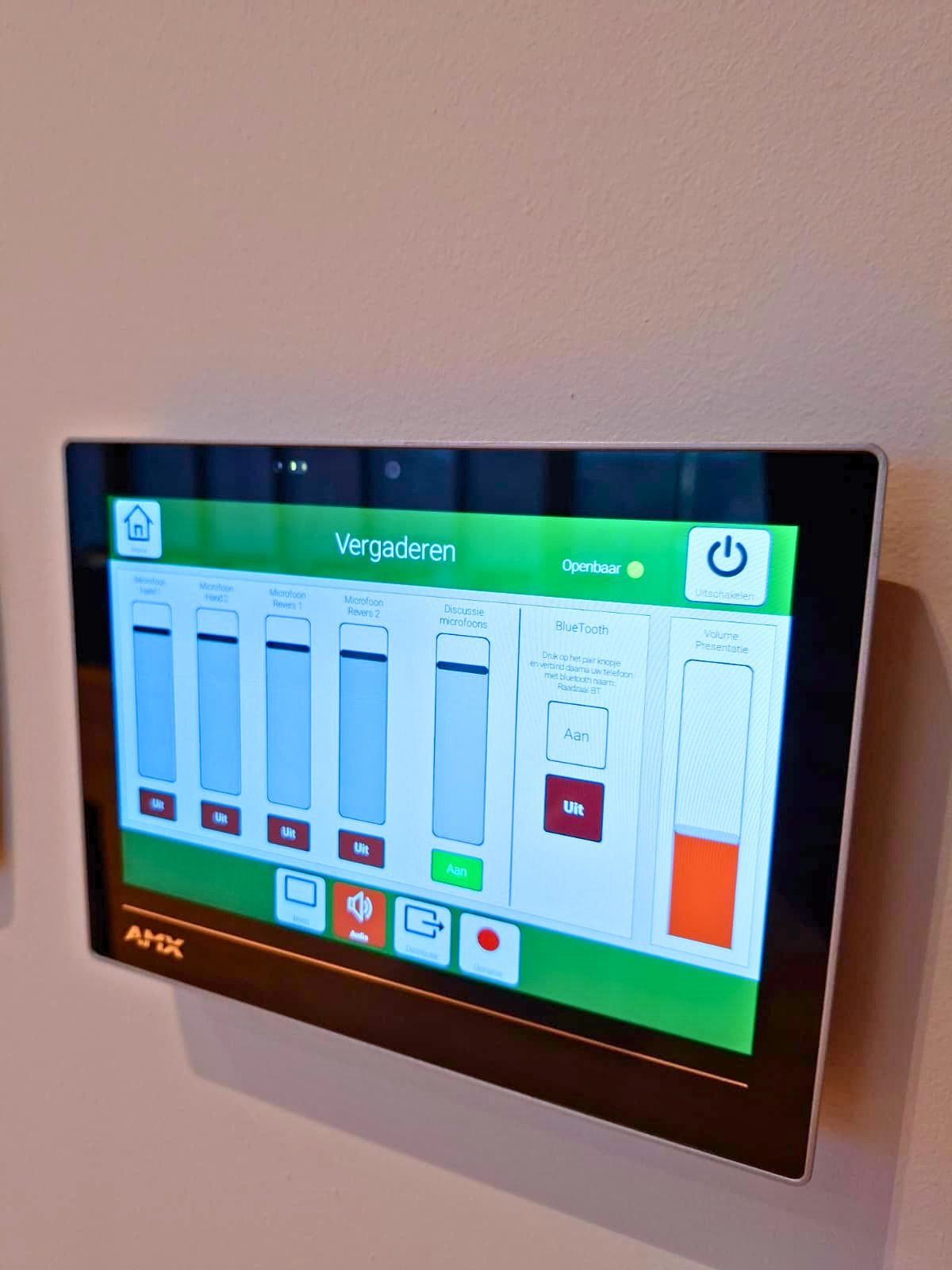 Daarnaast implementeerden we een nieuw AMX besturingssysteem. De volledige installatie is eenvoudig te bedienen via een vast touchscreenpaneel én een mobiele tablet.